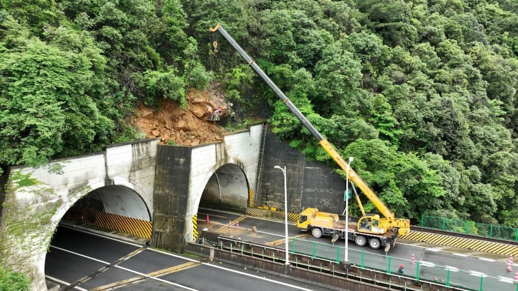 6月12日,南平高速公路養(yǎng)護(hù)部門(mén)工作人員在清理隧道頂部松動(dòng)的碎石。(受訪者供圖)