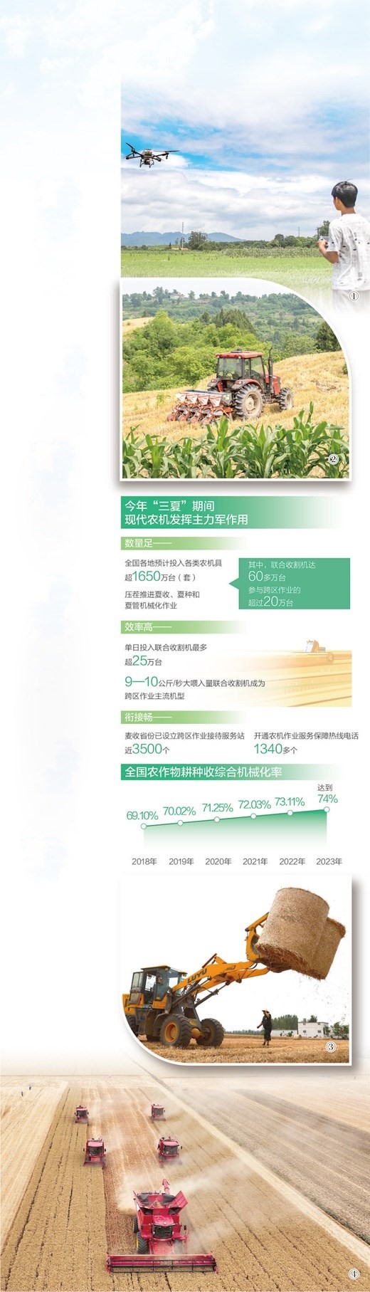 農(nóng)業(yè)現(xiàn)代化離不開(kāi)農(nóng)業(yè)機(jī)械化。大農(nóng)機(jī)和小農(nóng)機(jī)協(xié)同發(fā)力的背后,折射出農(nóng)業(yè)生產(chǎn)方式不斷轉(zhuǎn)變。今年“三夏”,全國(guó)各地預(yù)計(jì)投入各類農(nóng)機(jī)具超1650萬(wàn)臺(tái)(套),大型大馬力農(nóng)機(jī)、丘陵山區(qū)小型農(nóng)機(jī)等部分機(jī)具初步實(shí)現(xiàn)了“有好農(nóng)機(jī)用”,推動(dòng)農(nóng)業(yè)機(jī)械化邁上新臺(tái)階,全國(guó)農(nóng)作物耕種收綜合機(jī)械化率達(dá)到74%,農(nóng)機(jī)作業(yè)面積超過(guò)73億畝次。