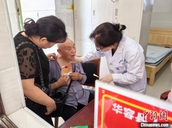 湖南華容縣人民醫(yī)院醫(yī)生正在給剛剛轉(zhuǎn)移到安置點的鮑松柏老人治療。中新網(wǎng)記者 白祖偕 攝