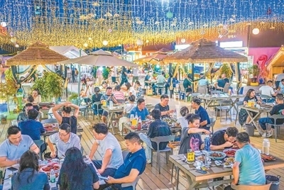 江蘇省宿遷經(jīng)濟技術開發(fā)區(qū)不斷豐富夜間經(jīng)濟消費業(yè)態(tài),著力打造集飲食、音樂、時尚、惠民等元素為一體的夜間消費市場。圖為7月5日,市民在該開發(fā)區(qū)黃河街道九鼎社區(qū)夜市品嘗美食。陳少帥攝(人民視覺)