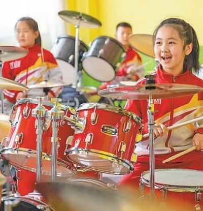 黑龍江省安達(dá)市任民鎮(zhèn)中心小學(xué),學(xué)生們?cè)诮淌揖毩?xí)架子鼓。新華社記者 謝劍飛攝