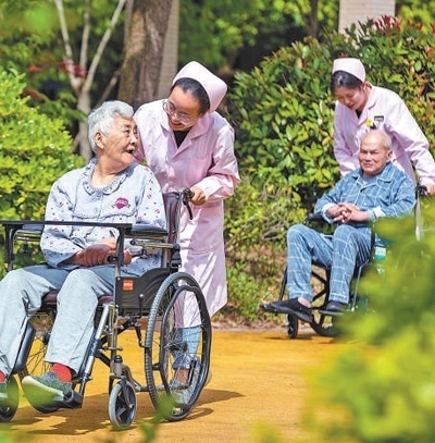 江蘇省南通市通州區(qū)一家頤養(yǎng)中心,護(hù)理人員推著老人在花園散心。翟慧勇攝(影像中國(guó))
