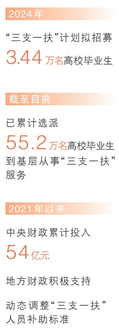在奮斗中書寫青春華章,在奉獻(xiàn)中成就事業(yè)。2006年“三支一扶”計(jì)劃開展以來,50多萬名高校畢業(yè)生扎根鄉(xiāng)村,開展支教、支農(nóng)、支醫(yī)等服務(wù)。2024年,“三支一扶”計(jì)劃擬招募3.44萬名高校畢業(yè)生到基層開展相關(guān)服務(wù)。