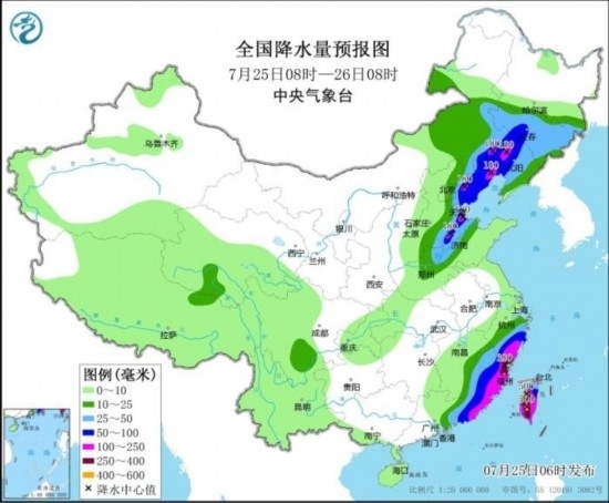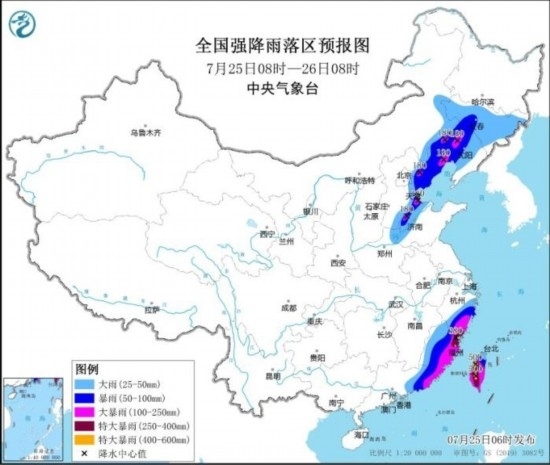 7月25日08時(shí)至26日08時(shí),內(nèi)蒙古東部、吉林、遼寧、天津、河北東部、河南北部、山東北部、浙江南部、福建、廣東東部、臺(tái)灣島等地部分地區(qū)有大到暴雨,其中,內(nèi)蒙古東南部、遼寧中西部、河北東北部、山東北部、浙江南部、福建東部、廣東東南部、臺(tái)灣島大部等地部分地區(qū)有大暴雨,福建東北部、臺(tái)灣島中南部等地局地特大暴雨(250~500毫米)。
