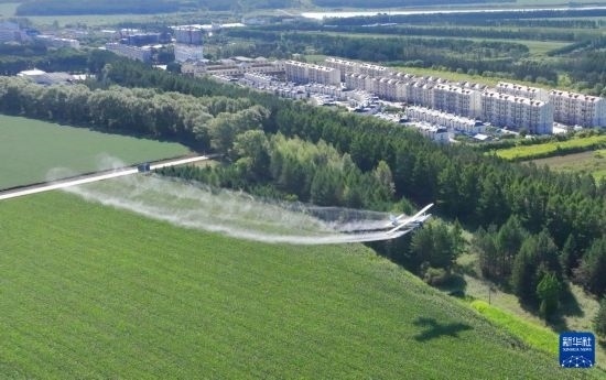 8月2日,農(nóng)用飛機在北大荒集團(tuán)黑龍江尖山農(nóng)場有限公司農(nóng)業(yè)科技服務(wù)中心玉米田噴施葉面肥(無人機照片)。