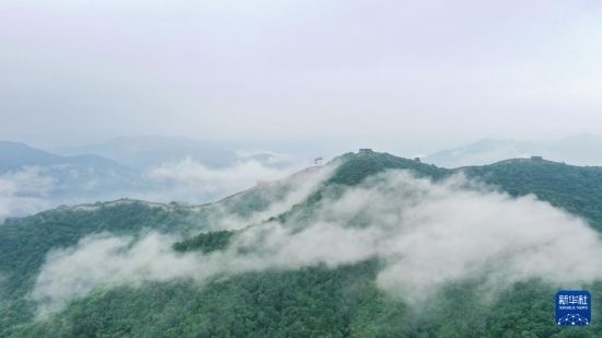 云霧繚繞的慕田峪長(zhǎng)城(8月3日攝,無(wú)人機(jī)照片)。