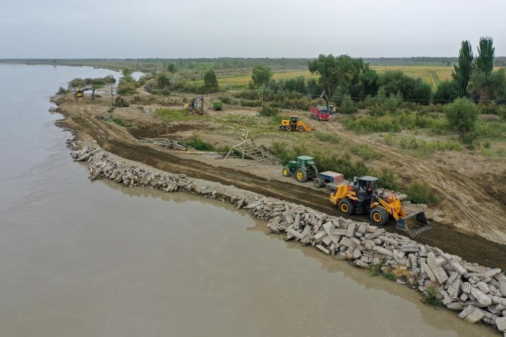 2024年8月3日,在新疆阿克蘇地區(qū)沙雅縣蓋孜庫木鄉(xiāng)吐央村,搶險(xiǎn)人員駕駛大型機(jī)械進(jìn)行堤壩加固(無人機(jī)照片)。新華社記者 丁磊 攝