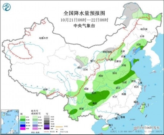 10月21日08時(shí)至22日08時(shí),內(nèi)蒙古河套地區(qū)和東北部、黑龍江西北部、甘肅河西、寧夏北部、陜西北部、山西北部、河北北部等地部分地區(qū)有小雪或雨夾雪。黑龍江北部、吉林南部、遼寧大部、陜西北部、黃淮、江淮大部、江漢、江南北部、西南地區(qū)大部、廣西西北部、海南島南部、臺(tái)灣島大部等地部分地區(qū)有小到中雨,其中,遼寧東部和南部、山東半島等地部分地區(qū)有大雨。內(nèi)蒙古中部、黑龍江西南部等地部分地區(qū)有5~6級(jí)風(fēng)。