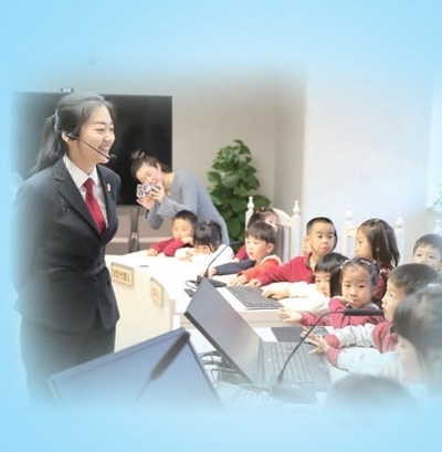 北京三中院組織開放日活動,法院干警(左一)為前來參觀的“小客人”介紹少年法庭。馬國強攝