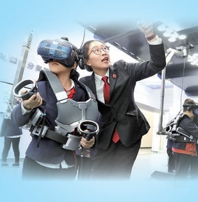 在浙江湖州市南潯區(qū)未成年人道德法治體驗館,南潯區(qū)人民法院法官(右一)指導小學生運用虛擬現實體驗設備接受法治教育。項 飛攝