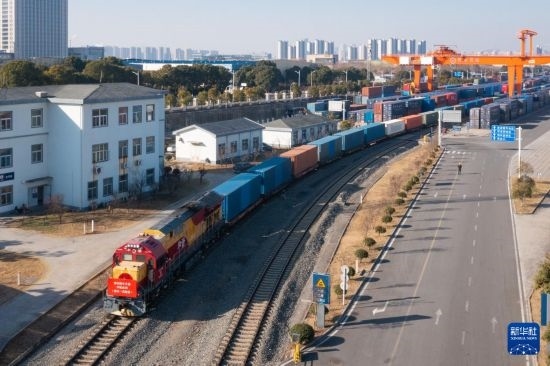 1月29日,滿載集裝箱的中歐班列駛離南京鐵路物流中心堯化門站貨場(無人機照片)。
