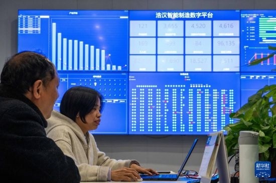 2月24日,在沅江高新區(qū)服裝產(chǎn)業(yè)園一家制衣企業(yè),工作人員通過智能制造數(shù)字平臺了解車間生產(chǎn)情況。