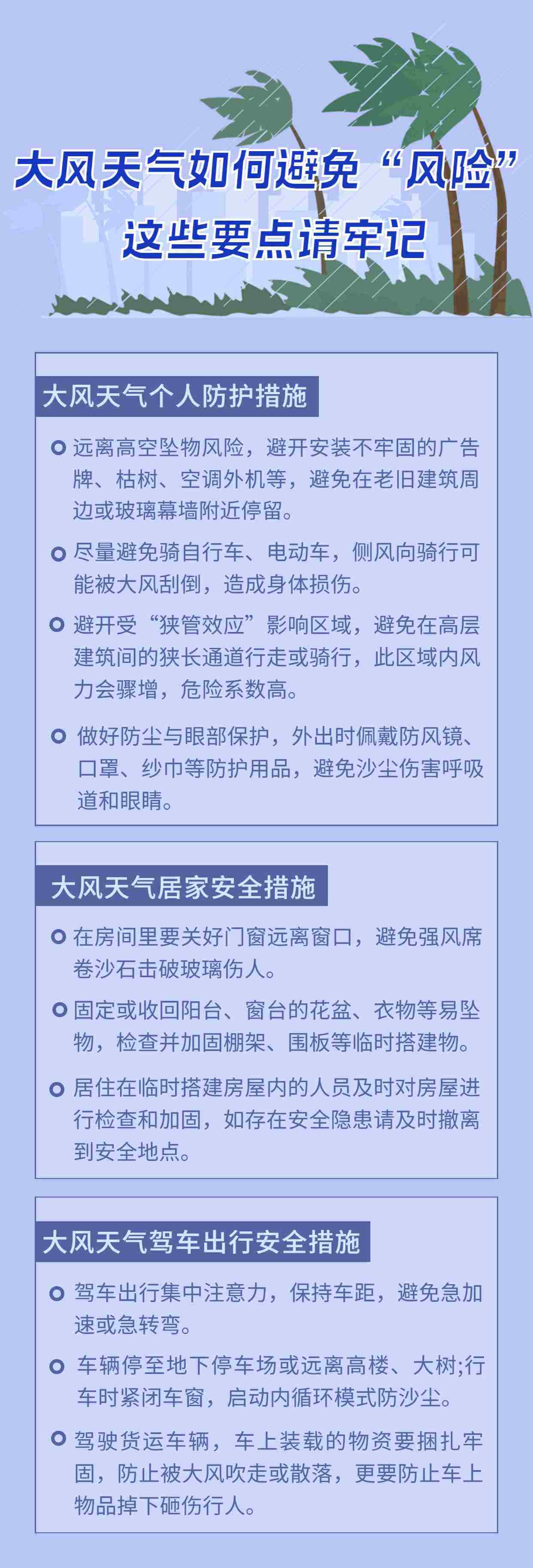 據(jù)氣象部門預(yù)報(bào),未來幾日,全國多地將出現(xiàn)強(qiáng)風(fēng)天氣,部分地區(qū)陣風(fēng)風(fēng)力可達(dá)12~13級(jí)。春季到來,大風(fēng)天氣增多,給我們的生活帶來了諸多安全隱患。該如何做好防范?一起來了解。
