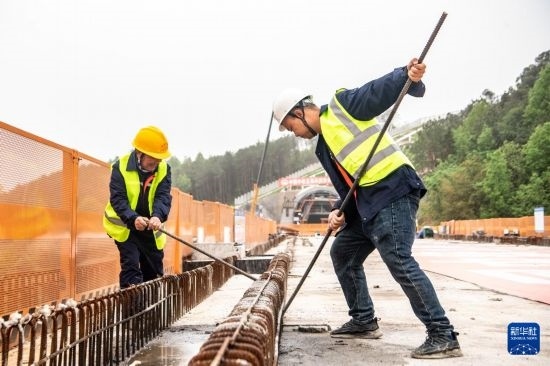4月12日,工人在成渝中線高鐵玄天湖雙線大橋建設(shè)現(xiàn)場(chǎng)施工作業(yè)。