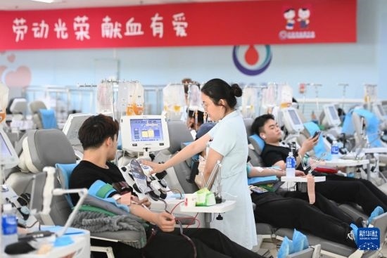 5月7日,在天津市血液中心,護士查看獻血者的狀態(tài)。
