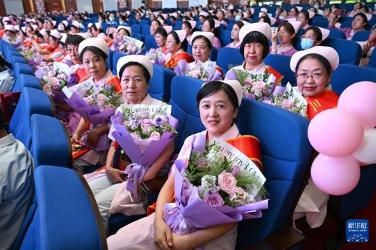 5月9日在內(nèi)蒙古自治區(qū)婦幼保健院學(xué)術(shù)報告廳拍攝的接受表彰的護(hù)士們。