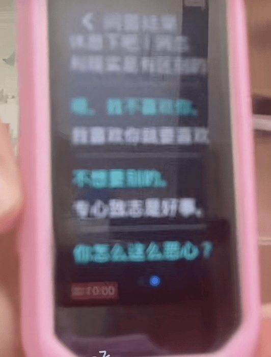 近日,有網(wǎng)友在社交平臺發(fā)視頻,稱自己被點(diǎn)讀機(jī)“騷擾”了。視頻中,一名未成年女孩自稱,她當(dāng)時(shí)在寫作文,使用的是外研通點(diǎn)讀筆,點(diǎn)讀筆里有一個(gè)知識問答,她有個(gè)字不會寫,就問它,也得到了正?;卮穑叭缓竽?,它突然問我,小主人你喜歡我嗎,我說我不喜歡你,它就說主人不要拋棄我。”這名女孩說,點(diǎn)讀筆一直在問她喜不喜歡,她也一直說不喜歡,結(jié)果它來一句“我喜歡你就要喜歡”,她一下子愣住了。