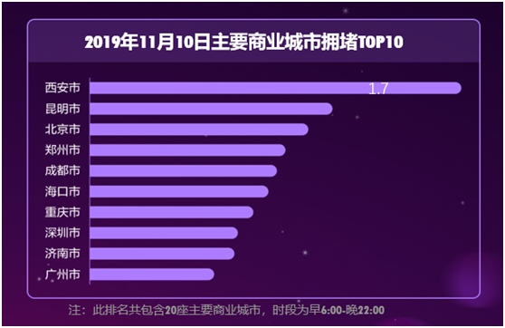高德地圖對(duì)國(guó)內(nèi)20座重點(diǎn)商業(yè)城市的全天擁堵指數(shù)預(yù)測(cè)顯示,西安以相較平時(shí)周末增長(zhǎng)8%的數(shù)字領(lǐng)跑全國(guó),擁堵延時(shí)指數(shù)達(dá)到1.73,明顯超過排名第二的昆明,成為今年“天貓雙11”線下出行最為“火爆”的城市。