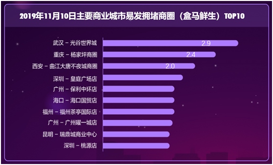 數(shù)據(jù)顯示,11月10日,盒馬鮮生所在區(qū)域易發(fā)生擁堵商圈排名前十位的依次是,武漢光谷世界城、重慶楊家坪、西安曲江大唐不夜城、深圳皇庭廣場(chǎng)店、廣州保利中環(huán)、海口國(guó)貿(mào)、福州茶亭國(guó)際、廣州曜一城、昆明瑞鼎城和深圳桃源。
