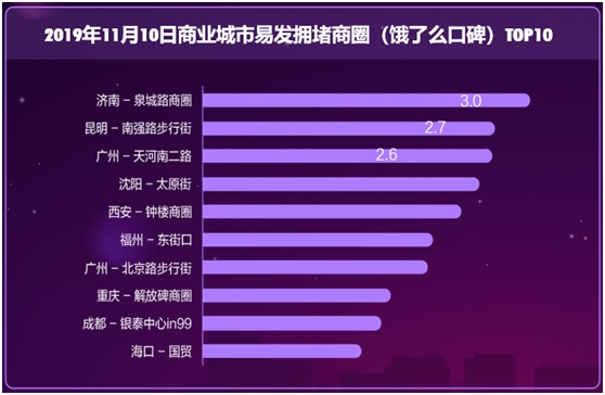 口碑餓了么線下商戶所在區(qū)域易發(fā)生擁堵商圈排名前十位的依次是,濟(jì)南泉城路、昆明南強(qiáng)步行街、廣州天河南二路、沈陽(yáng)太原街、西安鐘樓、福州東街口、廣州北京路步行街、重慶解放碑、成都銀泰中心in99和海口國(guó)貿(mào)。