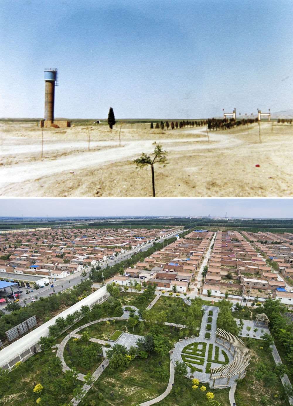 △上圖為寧夏永寧縣閩寧鎮(zhèn)建設(shè)初期的鄉(xiāng)鎮(zhèn)雛形;下圖為2016年7月22日拍攝的閩寧鎮(zhèn)原隆移民村。