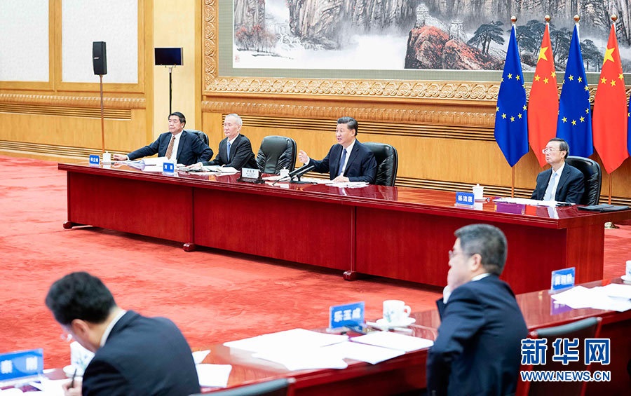 9月14日晚,國家主席習(xí)近平在北京同歐盟輪值主席國德國總理默克爾、歐洲理事會(huì)主席米歇爾、歐盟委員會(huì)主席馮德萊恩共同舉行會(huì)晤,會(huì)晤以視頻方式舉行。新華社記者李濤攝