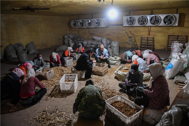 5月14日,村民在內(nèi)蒙古赤峰市松山區(qū)大廟鎮(zhèn)小廟子村中藥材合作社篩選中藥材。新華社記者劉磊攝