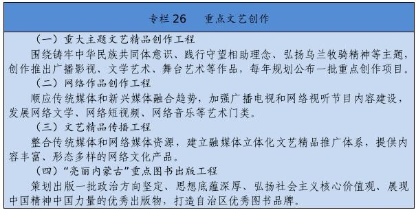 堅持以人民為中心的創(chuàng)作導向,創(chuàng)作生產(chǎn)出人民喜聞樂見的優(yōu)秀作品。繁榮發(fā)展新聞出版、廣播影視、文學藝術(shù),實施文藝作品質(zhì)量提升工程,加強優(yōu)秀劇本孵化和生活采風。推動重大主題文藝精品創(chuàng)作,加強現(xiàn)實題材創(chuàng)作生產(chǎn)。改進重點作品創(chuàng)作引導機制,建立重點文化藝術(shù)項目滾動扶持機制。設(shè)立內(nèi)蒙古文化藝術(shù)發(fā)展專項資金。加強文化文藝場館建設(shè)。制定文藝人才發(fā)展規(guī)劃,開展內(nèi)蒙古電影新導演計劃。實施文化潤心工程,以文藝創(chuàng)作鑄牢中華民族共同體意識。提升廣播電視和網(wǎng)絡視聽產(chǎn)品質(zhì)量,豐富網(wǎng)絡文藝內(nèi)容。搭建文藝精品遴選、展示、推出平臺,建設(shè)內(nèi)蒙古音樂廳,支持因地制宜建設(shè)綜合劇場、音樂廳和美術(shù)館,舉辦內(nèi)蒙古藝術(shù)節(jié)、內(nèi)蒙古音樂節(jié)等活動,大力實施文藝惠民演出和地方戲傳承創(chuàng)新工程,定期舉辦全區(qū)地方戲優(yōu)秀劇目展演以及音樂、舞蹈、小戲小品專業(yè)賽事,打造獨具特色的文化藝術(shù)品牌。