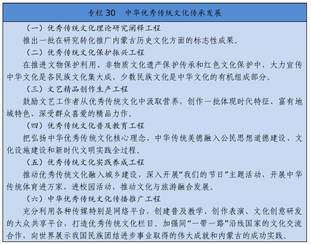 實施文化遺產(chǎn)系統(tǒng)性保護工程,強化重要文化和自然遺產(chǎn)、非物質(zhì)文化遺產(chǎn)系統(tǒng)性保護,建立整體保護、活態(tài)傳承、創(chuàng)新發(fā)展體系。實施重大文物保護工程,推進長城、黃河國家文化公園和大窯、遼上京、和林格爾土城子等國家考古遺址公園建設(shè)。推動萬里茶道(內(nèi)蒙古段)、遼上京和祖陵遺址、紅山遺址群和陰山巖刻申遺。加強阿爾寨石窟寺等石窟文物保護。開展“中華文明探源”工程、“考古中國”河套地區(qū)早期聚落遺址考古發(fā)掘研究。建設(shè)內(nèi)蒙古非遺博覽園、內(nèi)蒙古黃河文化博物館、內(nèi)蒙古工業(yè)博物館。加強紀念館、展覽館、博物館建設(shè)管理。推進民族優(yōu)秀傳統(tǒng)手工藝保護傳承和振興,完善非遺名錄體系。實施中華傳統(tǒng)節(jié)日振興工程,開展傳統(tǒng)節(jié)日禮儀禮節(jié)教育活動。