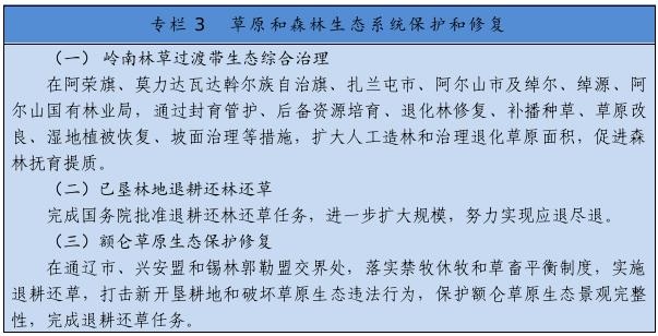 把保護草原、森林作為首要任務,嚴格執(zhí)行基本草原保護制度,落實草原生態(tài)保護補助獎勵政策,完善草畜平衡和草原禁牧休牧制度。嚴禁在草原上亂采濫挖、新上礦產(chǎn)資源開發(fā)等工業(yè)項目,已批準在建運營的礦山、風電、光伏等項目到期退出,新建風電、光伏電站重點布局在沙漠荒漠、采煤沉陷區(qū)、露天礦排土場,推廣“光伏+生態(tài)治理”基地建設(shè)模式。開展草原生態(tài)承載能力核定和草原生態(tài)系統(tǒng)健康評價,實施草原保護和修復重大工程??茖W開展大規(guī)模國土綠化行動,實施三北防護林體系建設(shè)、公益林保護、森林質(zhì)量精準提升等工程,探索大興安嶺一體化保護模式,推進已墾森林草原退耕還林還草,加強森林撫育和退化林修復,提升生態(tài)系統(tǒng)質(zhì)量和穩(wěn)定性。加快構(gòu)建以國家公園為主體的自然保護地體系。