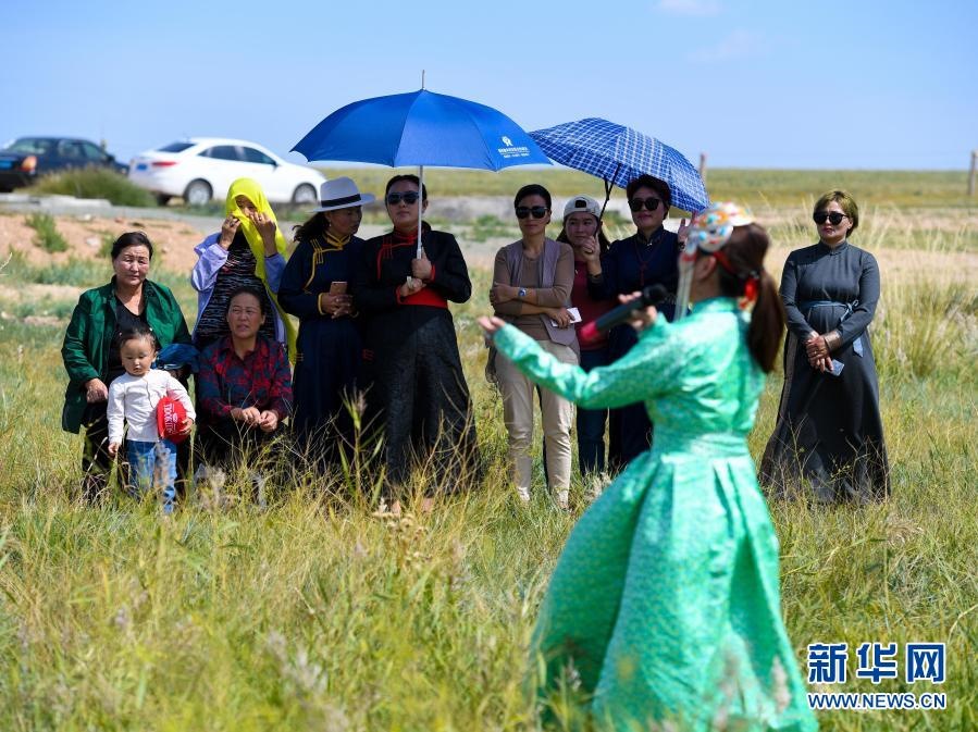 2018年9月13日,在內(nèi)蒙古自治區(qū)錫林郭勒盟鑲黃旗寶格達(dá)音高勒蘇木浩尼欽哈夏圖嘎查的一處草場(chǎng),鑲黃旗烏蘭牧騎的隊(duì)員在為牧民表演文藝節(jié)目。新華社記者 彭源 攝