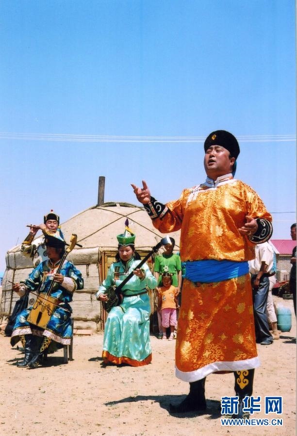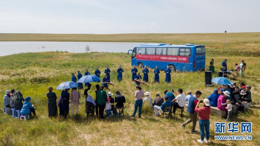 錫林郭勒盟烏蘭牧騎隊(duì)員在草原上為牧民演出(資料照片)。新華社發(fā)