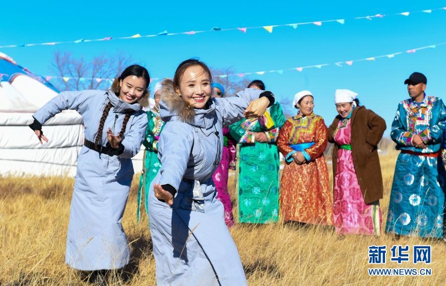2018年11月9日,內(nèi)蒙古自治區(qū)錫林郭勒盟烏蘭牧騎隊(duì)員來(lái)到西烏珠穆沁旗烏蘭哈拉嘎蘇木新高勒嘎查的黨員中心戶(hù)恩克巴雅爾家,為周邊牧民表演舞蹈。新華社記者 彭源 攝