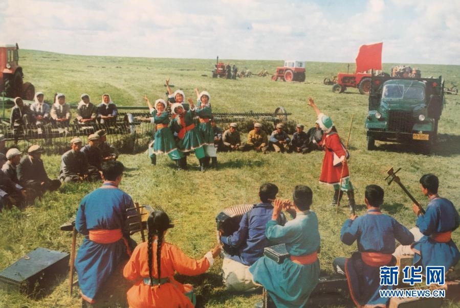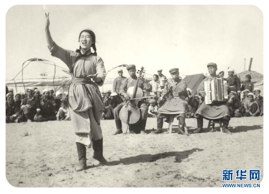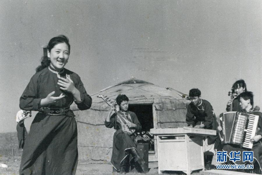 20世紀(jì)六七十年代,內(nèi)蒙古自治區(qū)錫林郭勒盟蘇尼特右旗烏蘭牧騎隊(duì)員在草原上為周邊牧民表演節(jié)目(資料照片)。新華社發(fā)
