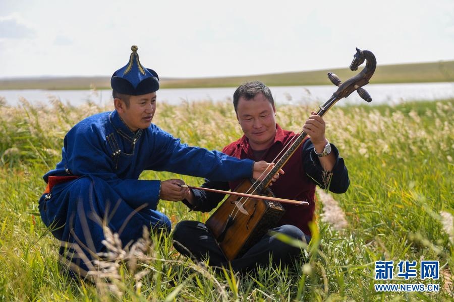 2018年9月13日,在內(nèi)蒙古自治區(qū)錫林郭勒盟鑲黃旗寶格達(dá)音高勒蘇木浩尼欽哈夏圖嘎查的一處草場(chǎng),鑲黃旗烏蘭牧騎的隊(duì)員在為牧民演奏馬頭琴。新華社記者 彭源 攝