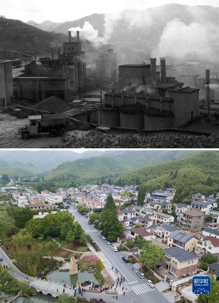 這是一張拼版照片,上圖為:浙江省湖州市安吉縣天荒坪鎮(zhèn)余村二十世紀八十年代的資料照片;下圖為:2018年4月24日,游客在整修一新的余村游覽(新華社記者翁忻旸攝)。新華社發(fā)