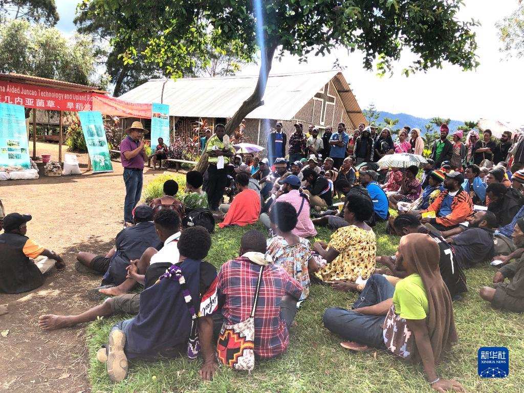 2020年12月15日,中國援巴布亞新幾內(nèi)亞菌草旱稻項目專家組組長林應興(戴草帽者)在巴布亞新幾內(nèi)亞東高地省中國援助巴新菌草和旱稻技術項目第9期培訓班上授課。新華社發(fā)