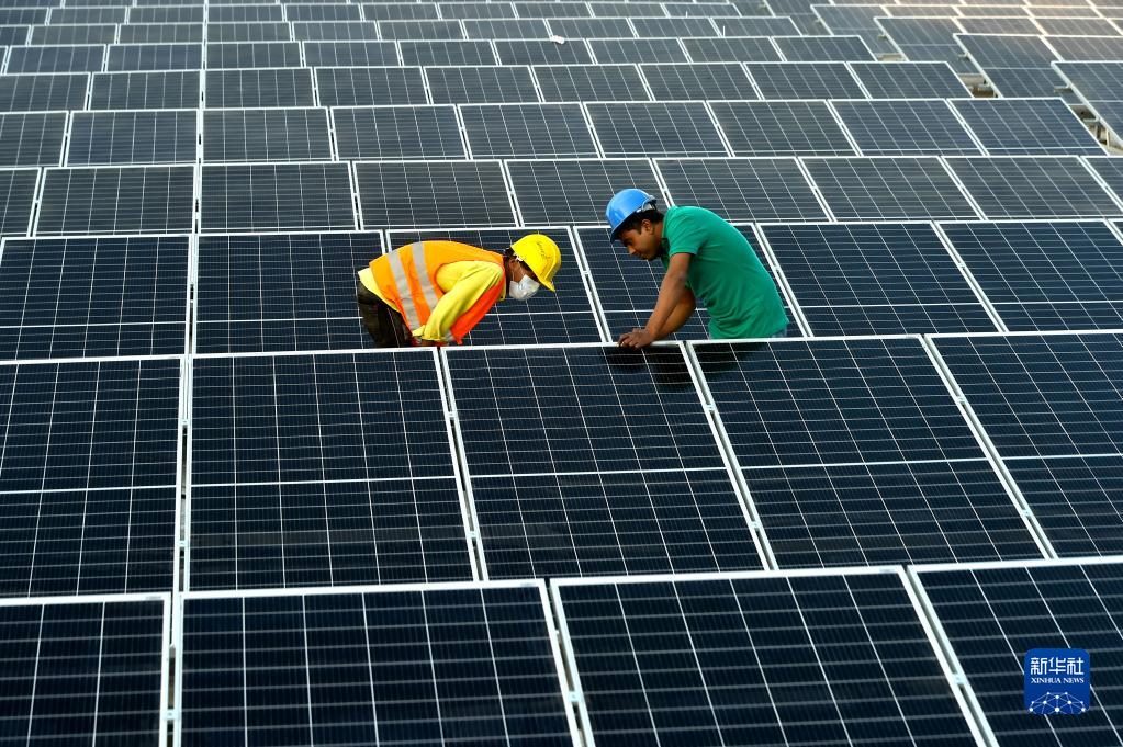 2021年1月3日,在位于孟加拉國首都達卡郊區(qū)的利德成集團廠區(qū),工人們在房頂組裝光伏模組。從2020年開始,中資制衣類企業(yè)——利德成集團在其位于孟加拉國達卡的廠區(qū)內(nèi)建設光伏電站,以降低對傳統(tǒng)能源的依賴,減少碳排放,從綠色發(fā)展的角度助力“一帶一路”建設。新華社發(fā)