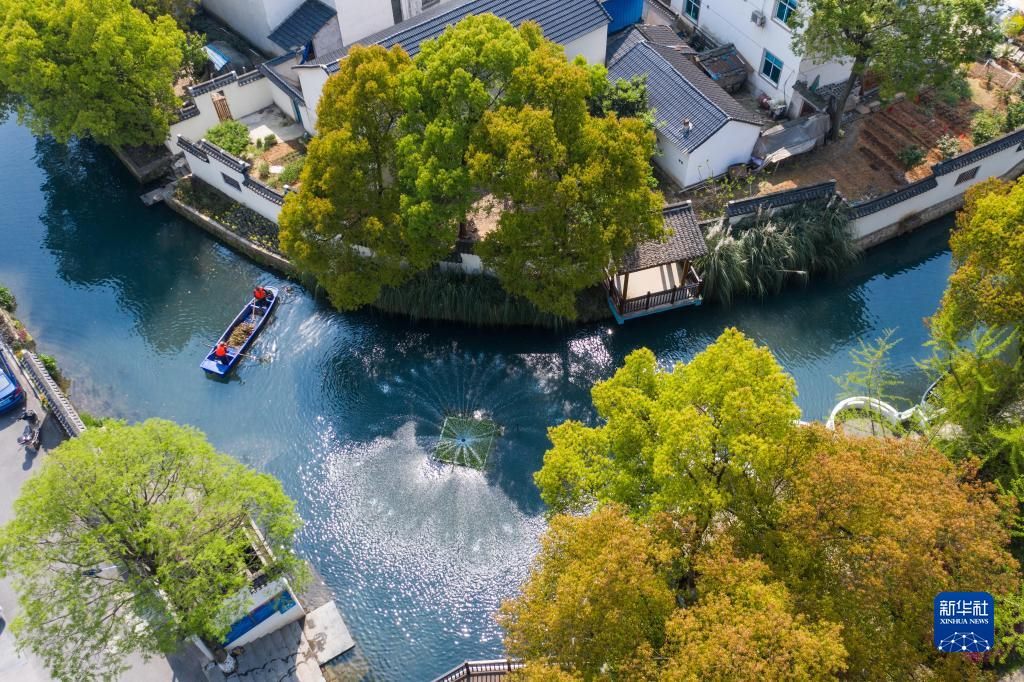 在浙江省長興縣龍山街道渚山村,保潔人員進行日常河道護理巡查(2020年4月9日攝,無人機照片)。新華社記者徐昱攝