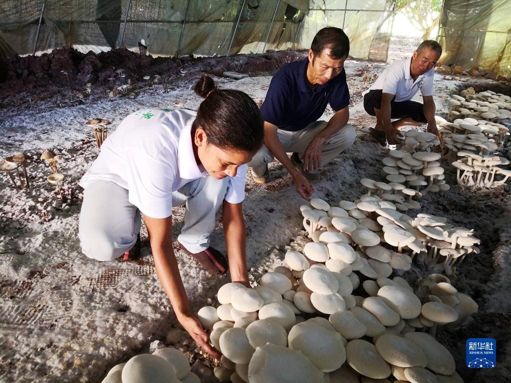 2018年6月12日,在斐濟楠迪,中國專家和當?shù)毓蛦T檢查菌菇生長情況。新華社記者張永興攝