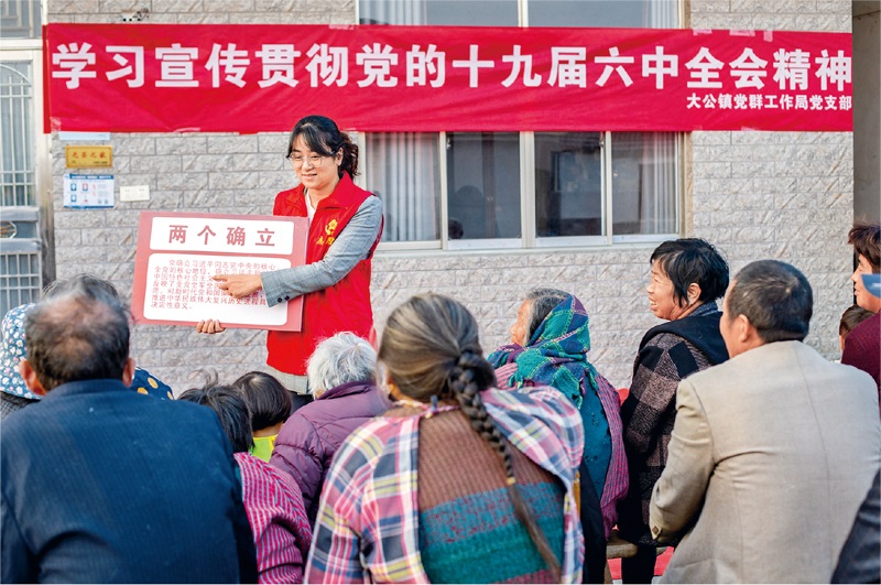 2021年11月18日,江蘇省南通市海安市大公鎮(zhèn)黨員志愿者在常河村12組向村民宣傳黨的十九屆六中全會精神,用老百姓聽得懂、能領(lǐng)會的方式將全會精神傳達到基層。人民視覺翟慧勇/攝