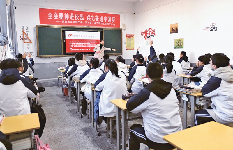 2021年11月24日,安徽省安慶市大觀區(qū)集賢路街道團工委、碟子塘社區(qū)紅領(lǐng)工作站聯(lián)合開展黨的十九屆六中全會精神宣講進校園活動。中新社發(fā)項順平/攝