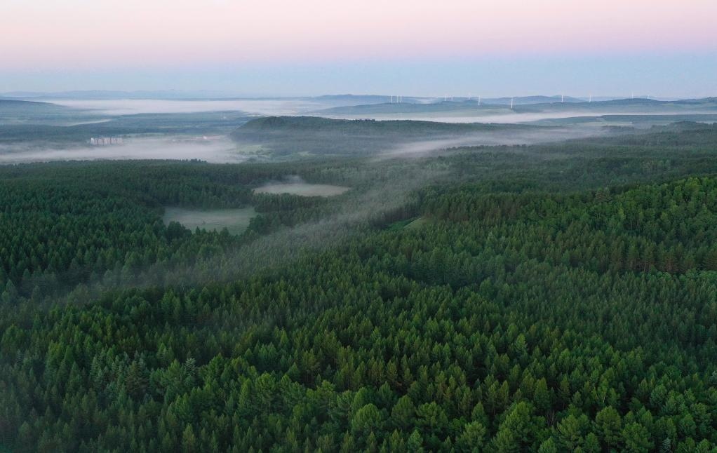 2021年6月27日拍攝的塞罕壩國(guó)家森林公園晨景(無(wú)人機(jī)照片)。新華社記者楊世堯攝