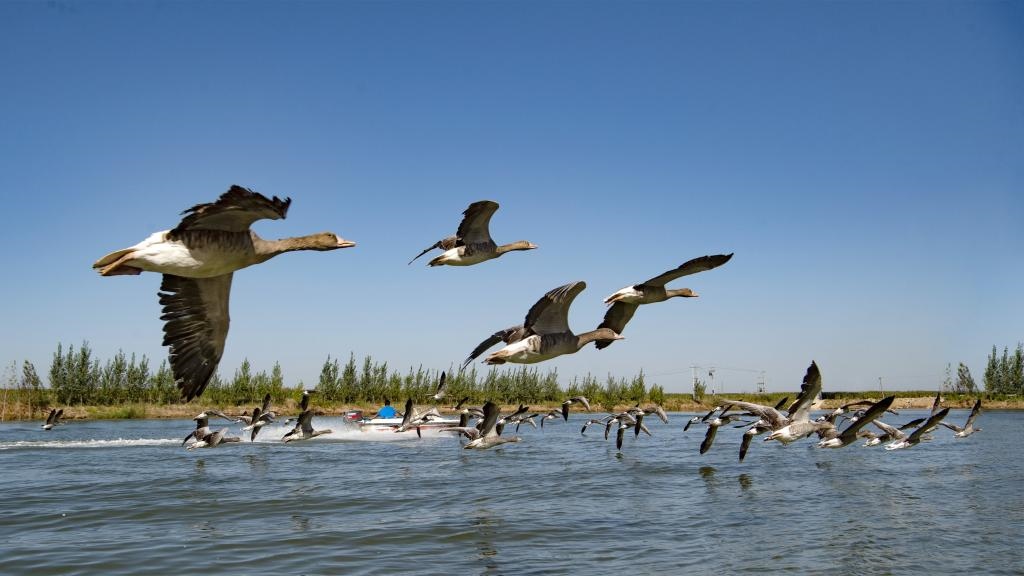 一群灰雁在衡水湖國(guó)家濕地公園水面上嬉戲飛翔(2018年9月28日攝)。新華社記者朱旭東攝