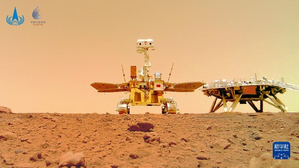 這是“著巡合影”圖。2021年6月11日,國家航天局在北京舉行天問一號(hào)探測器著陸火星首批科學(xué)影像圖揭幕儀式,公布了由祝融號(hào)火星車拍攝的著陸點(diǎn)全景、火星地形地貌、“中國印跡”和“著巡合影”等影像圖。首批科學(xué)影像圖的發(fā)布,標(biāo)志著我國首次火星探測任務(wù)取得圓滿成功。新華社發(fā)(國家航天局供圖)