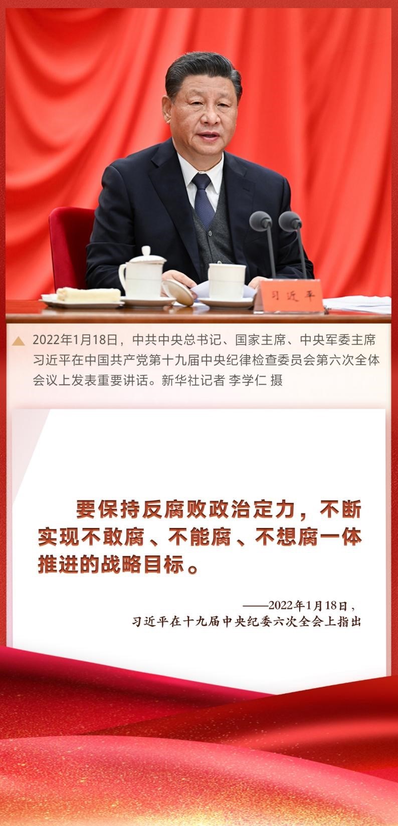 “要保持反腐敗政治定力,不斷實(shí)現(xiàn)不敢腐、不能腐、不想腐一體推進(jìn)的戰(zhàn)略目標(biāo)。”中共中央總書(shū)記、國(guó)家主席、中央軍委主席習(xí)近平在十九屆中央紀(jì)委六次全會(huì)上發(fā)表重要講話,深刻總結(jié)新時(shí)代黨的自我革命的成功實(shí)踐,深刻闡述全面從嚴(yán)治黨取得的歷史性、開(kāi)創(chuàng)性成就,產(chǎn)生的全方位、深層次影響,對(duì)堅(jiān)持不懈把全面從嚴(yán)治黨向縱深推進(jìn)、迎接黨的二十大勝利召開(kāi)作出戰(zhàn)略部署。