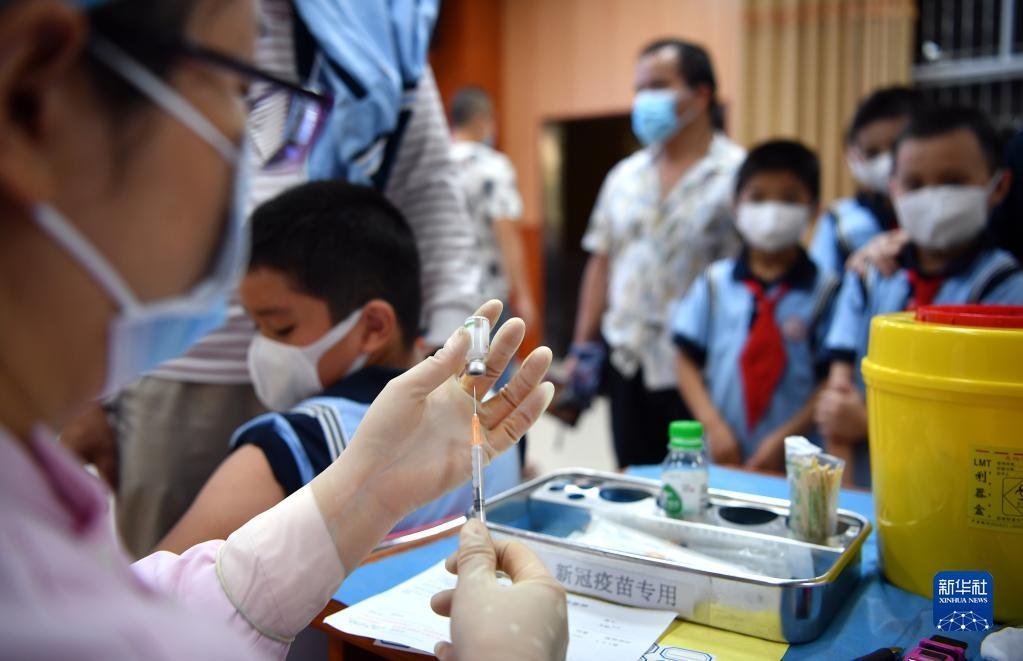 醫(yī)護人員在??谑协偵降谌W為學生接種疫苗(2021年10月28日攝)。新華社記者 郭程 攝