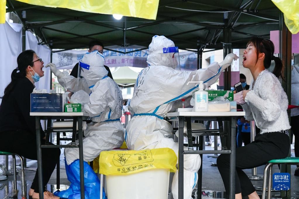 3月13日,在深圳羅湖區(qū)向西村核酸檢測點(diǎn),醫(yī)務(wù)人員為居民進(jìn)行核酸采樣。新華社發(fā)(儲焱攝)