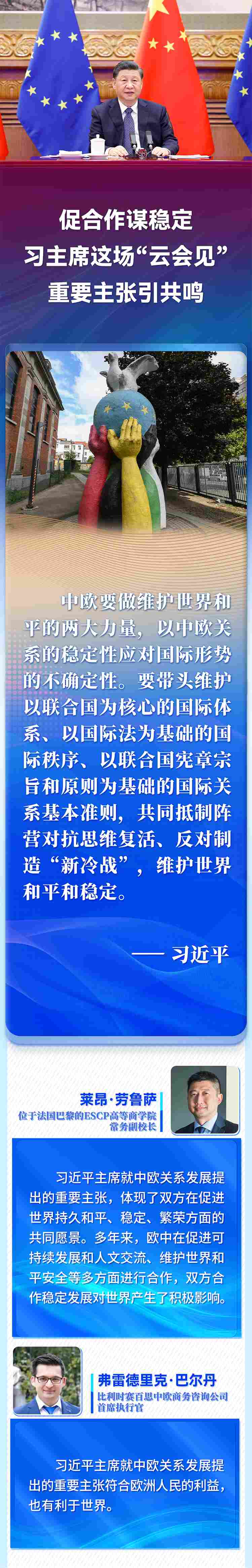 國家主席習(xí)近平4月1日晚在北京以視頻方式會見歐洲理事會主席米歇爾和歐盟委員會主席馮德萊恩。歐洲多國人士高度評價習(xí)近平主席就中歐關(guān)系、烏克蘭危機等問題提出的重要主張,認(rèn)為會晤為雙方關(guān)系持續(xù)健康發(fā)展作出戰(zhàn)略引領(lǐng),為復(fù)雜動蕩的國際局勢注入穩(wěn)定性。