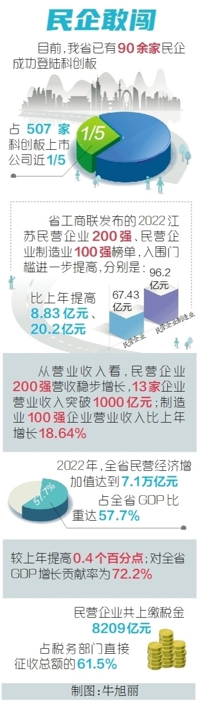 民營(yíng)企業(yè)不斷發(fā)展壯大,民營(yíng)經(jīng)濟(jì)走向更加廣闊的舞臺(tái)。近年來(lái)成立的兩家民營(yíng)銀行,成為全省民企敢闖敢試的生動(dòng)寫(xiě)照。江蘇蘇寧銀行是江蘇首家民營(yíng)銀行,成立以來(lái)累計(jì)服務(wù)小微企業(yè)客戶超120萬(wàn)戶,為小微客戶提供資金支持超1000億元。截至2022年末,該行普惠小微企業(yè)貸款余額226.38億元,較年初增加45.38%,占各項(xiàng)貸款余額的40.14%,增幅和占比均遠(yuǎn)高于全國(guó)銀行業(yè)平均水平。成立于2020年的無(wú)錫錫商銀行,則在成立之初就提出,將積極探索具有物聯(lián)網(wǎng)金融特色的科技型銀行,成為民營(yíng)銀行中“現(xiàn)代企業(yè)制度+企業(yè)黨建+社會(huì)責(zé)任”的樣板,打造成全國(guó)民營(yíng)銀行的標(biāo)桿。